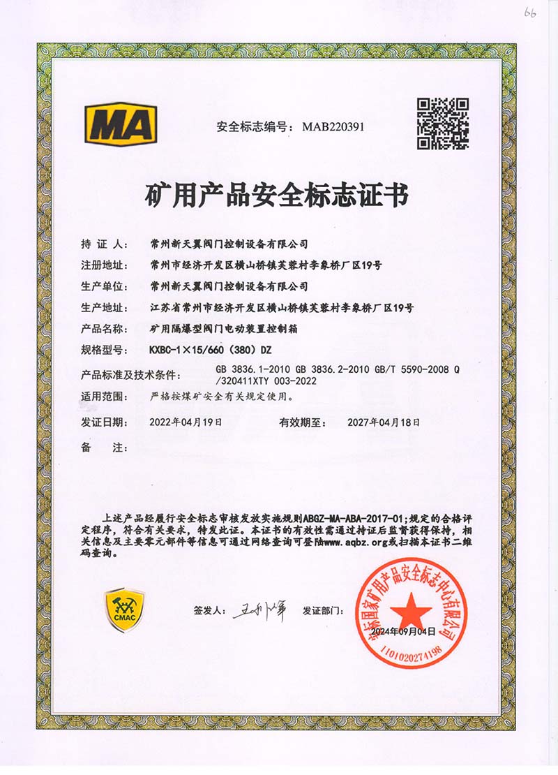 礦用隔爆QB(380V 660V) 國家強制性產品認證證書104.1